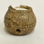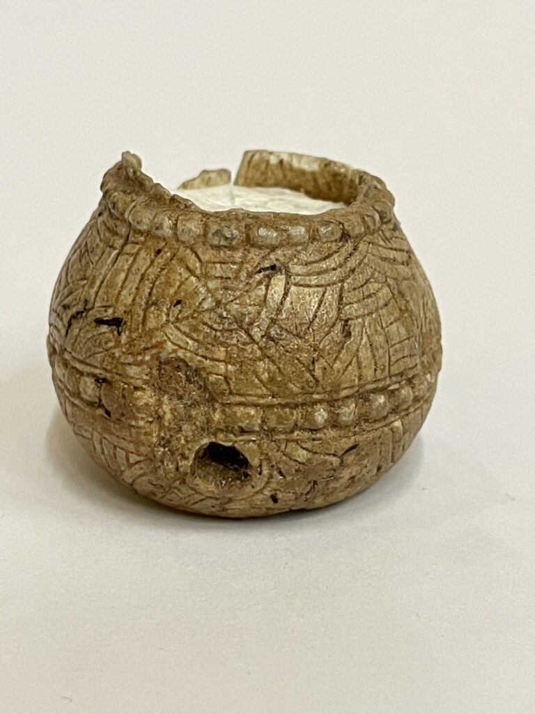 出土場所 熊本県宇城市不知火町 出土遺跡名 国越(くにごし)古墳 時代 古墳時代後期 ・6世紀中頃 法量(大きさ)㎝ 径3.6、高2.8 備考 古墳の副葬品。鹿角の加工品。全面に直弧文(ちょっこもん)と呼ばれる装飾文様を施してある。使用目的は武器を飾るものと考えられ、矛の基部に装着するために空けられた孔がある。