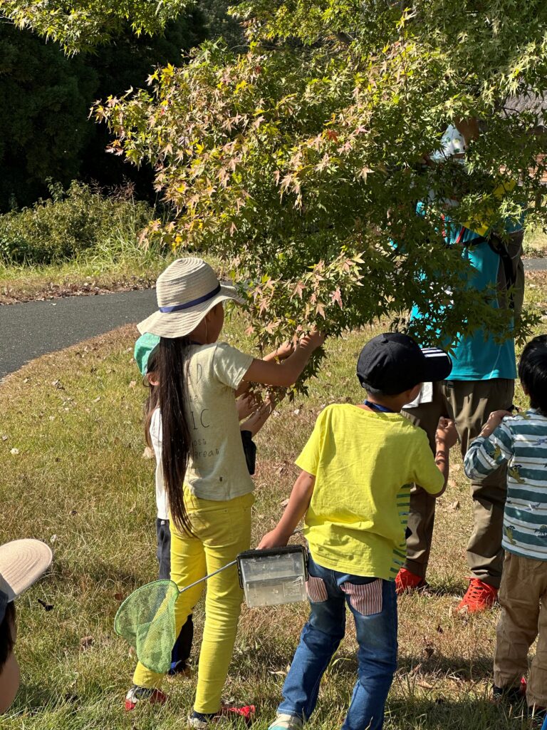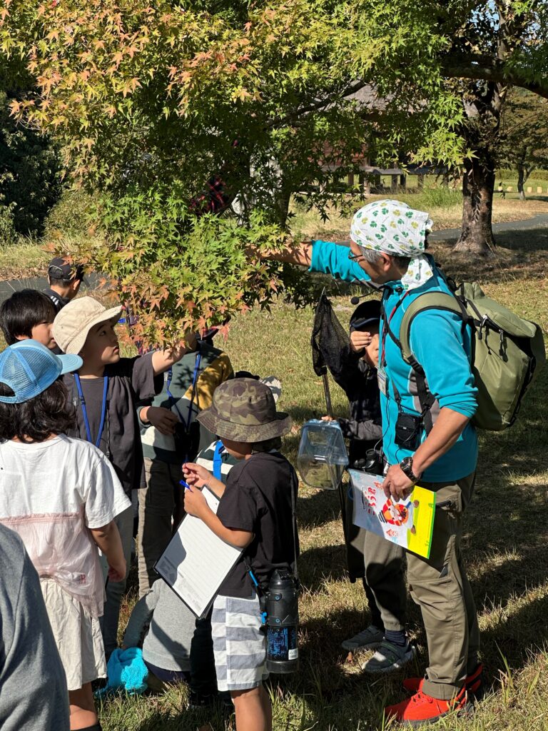 すっかり秋色に染まった鞠智城の中を、熊本県博物館ネットワークセンターの専門学芸員さんと一緒にワクワクしながら歩きました。自然観察ポイントにさしかかると、学芸員さんのリードで「木」や「葉っぱ」、「虫」、「動物の痕跡(そう!「ウンコ」💩です)」を観察したり、探したりします。