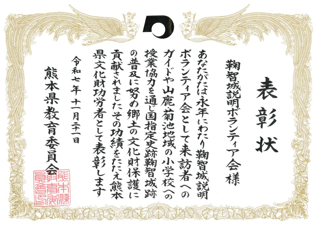 鞠智城説明ボランティア会が、令和7年度 熊本県文化財功労者として熊本県教育委員会から表彰されました。