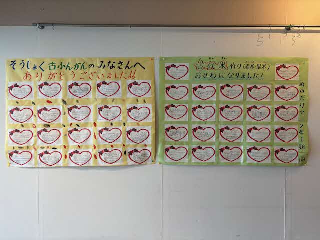 心のこもったお手紙、とても嬉しかったです。一緒に古代米づくりをした職員も喜んでいます。いただいたお手紙は体験棟の廊下に掲示しています。