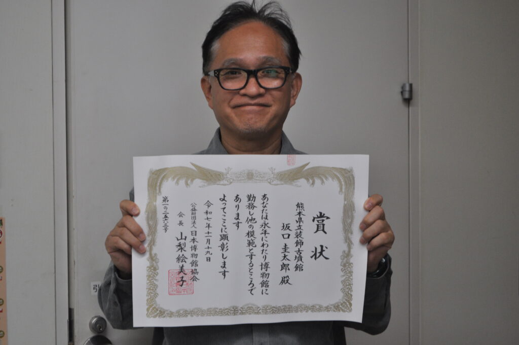 実は坂口さん、当館での長年の功績が認められ、先日大阪市で開催された第73回全国博物館大会において、令和7年度公益財団法人日本博物館協会博物館功労者顕彰を受けたとってもすごい人なんです。もしかしたら館内外での説明・案内や体験教室、講演等で話を聞く機会があるかもしれませんよ。