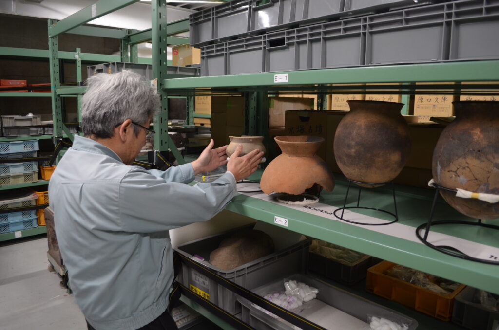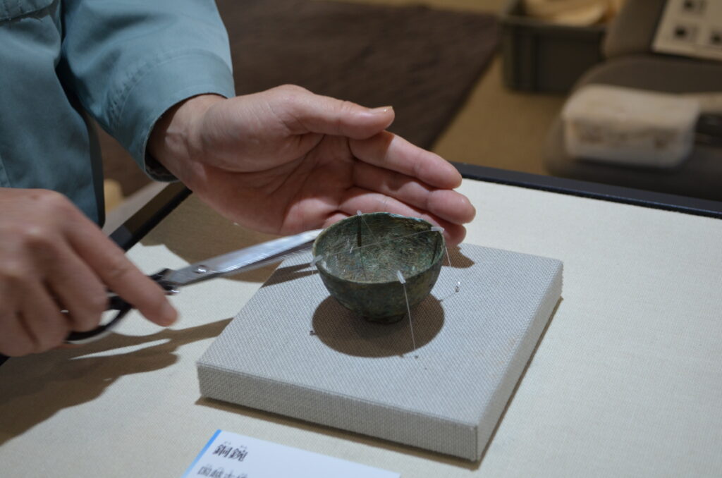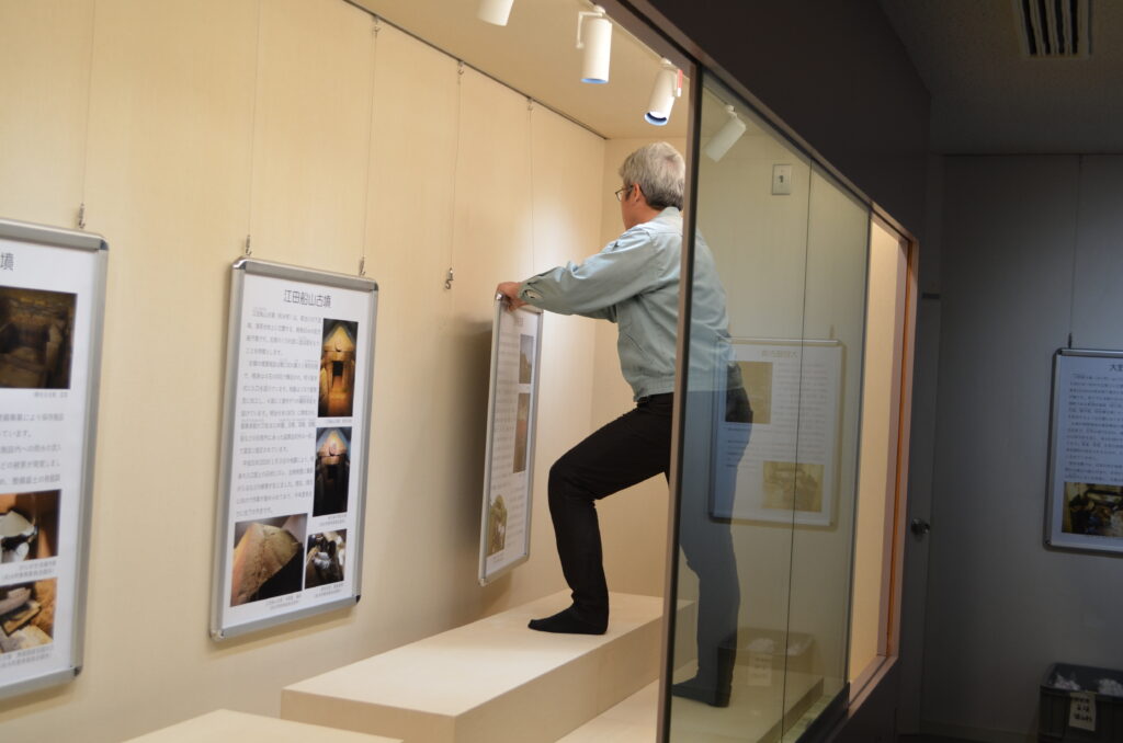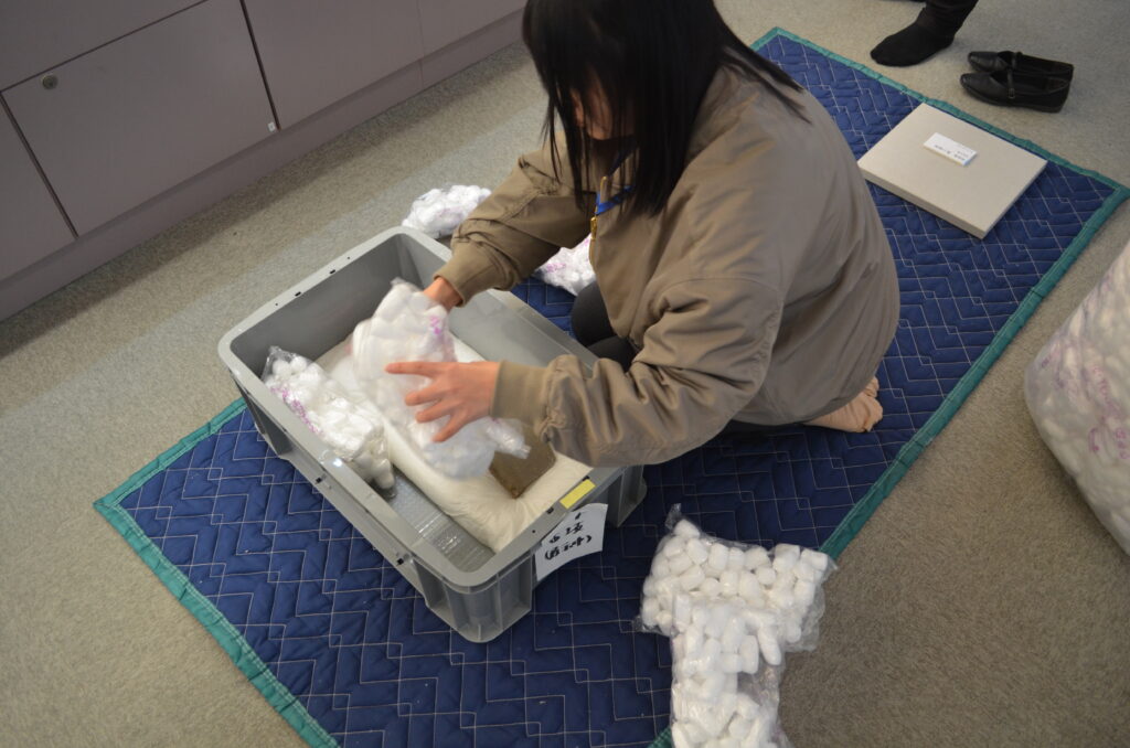 2026.02.15 学芸員のお仕事紹介~展示撤収編~ 不定期でお伝えしています学芸員のお仕事紹介です。今回は2月8日(日)に終了した企画展~被災古墳の現在~展示撤収編です。 企画展終了後の展示室の様子を覗いてみましょう! 選りすぐりの遺物やパネルが、きれいに並べられていますね。撤収するのは少しもったいない気もしますが、次の企画展のために、撤収作業開始です! パネルを丁寧に撤去します。工具を使って外しています。 展示ケースの中も遺物、パネルの順に撤去します。靴を脱いで、照明やガラスに当たらないようにそ~っとそ~っと運びます。 展示のお仕事を終えた遺物は、それぞれお部屋に帰ります。お布団に寝かせて、傷がつかないように緩衝材で保護します。 この椀は、どうやって撤収するのかな? 地震等で傾かないようにしっかりと固定しているので、固定具をハサミで切って外します。貴重な遺物なので、手を添えて優しく慎重に作業します。 ケースに入れられない遺物は、台に乗せて保管します。学芸員の慎重な手つき、目線をご覧ください。遺物への愛が感じられますね。 次回は展示設営編をご紹介する予定です。 この記事をシェアする