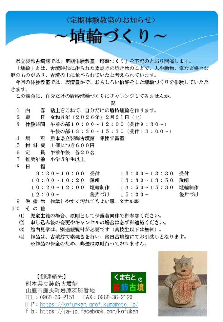当館学芸員が埴輪づくり専用に心をこめて作った特製の粘土を使用して、世界に一つだけの埴輪を作ってみませんか?制作した埴輪は、数週間乾燥させた後に当館で焼き上げてお渡しします。