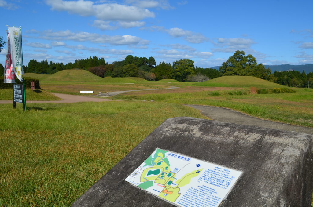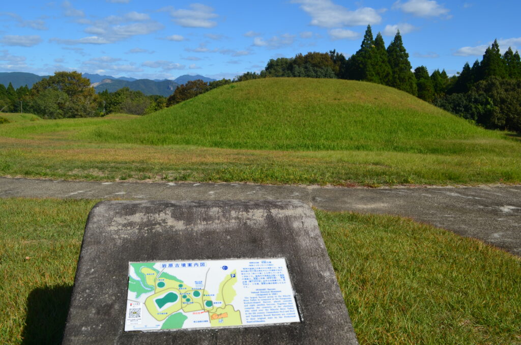 案内図奥に見えるのは馬不向1号墳、最も左の前方後円墳は岩原双子塚古墳です。
