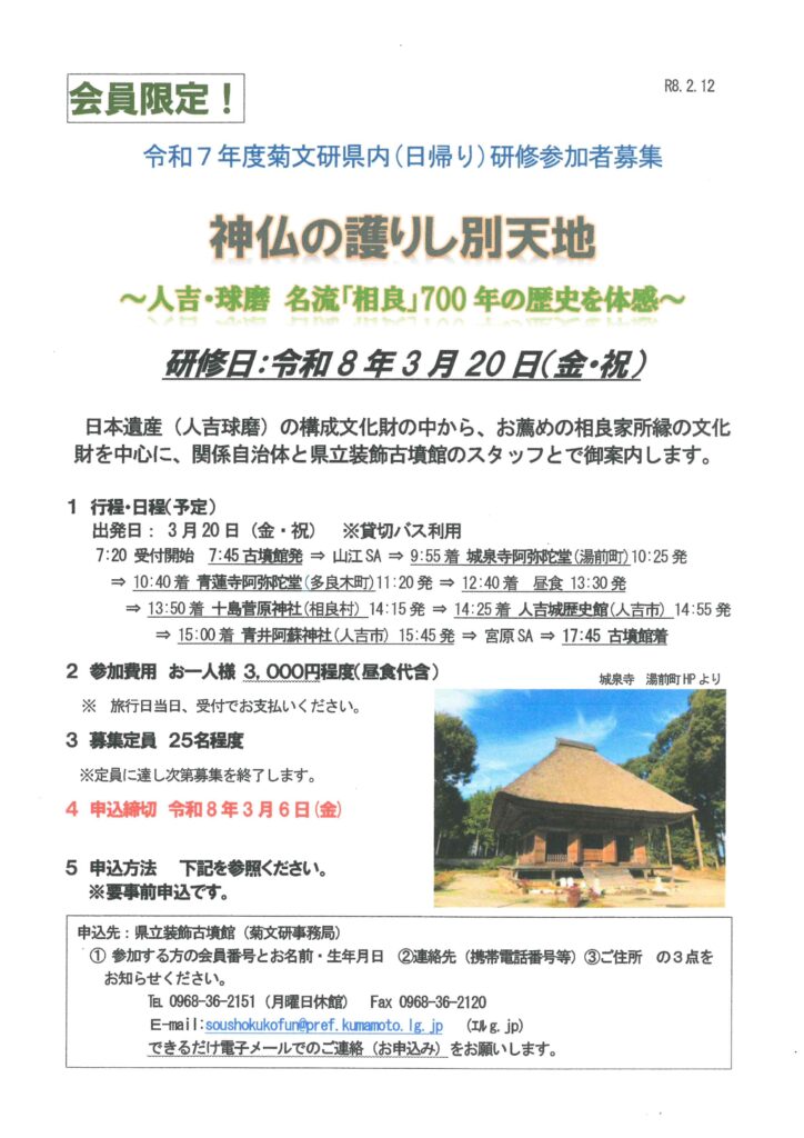 お申し込みは、菊文研事務局(装飾古墳館内 E-mail:soushokukofun@pref.kumamoto.lg.jpまたは℡0968-36-2151)まで(申込〆切:令和8年3月6日(金) 定員達し次第募集を終了します。)。
