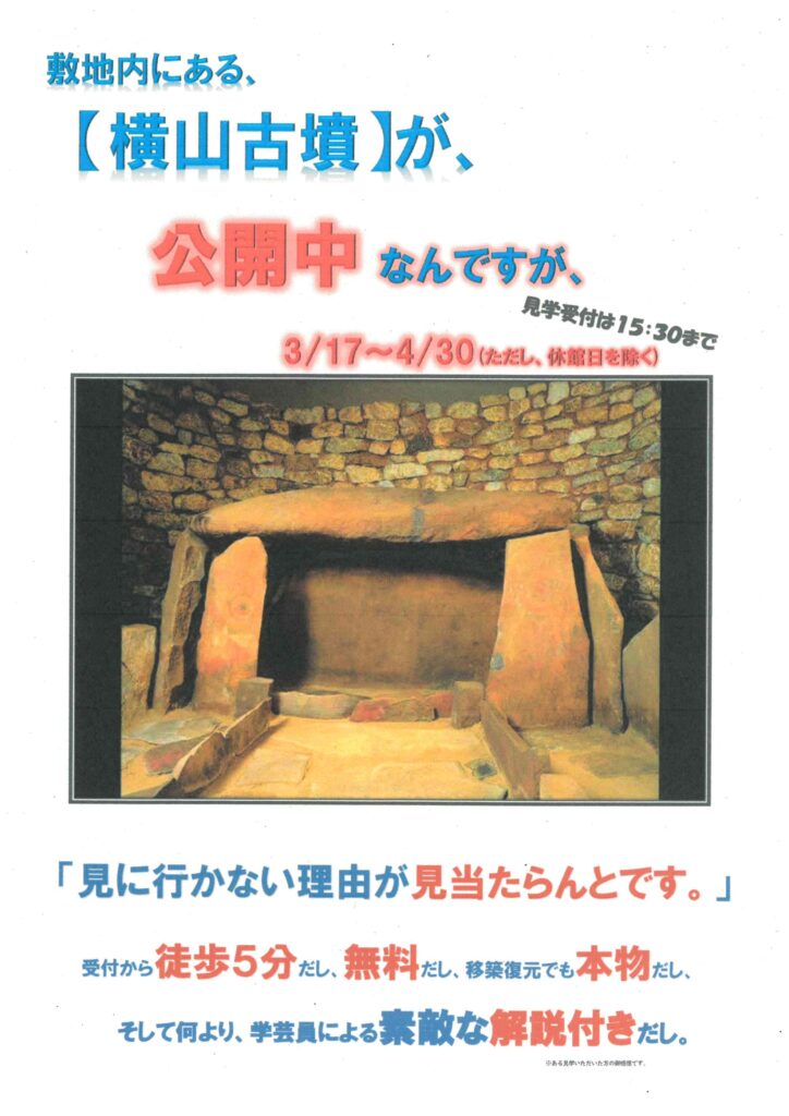 装飾古墳館の敷地内にある横山古墳(熊本市北区植木町から移築復元)を、以下のとおり一般公開します。この機会に、全国で5例しかない双脚輪状文を持つ「本物」の装飾古墳をお楽しみください。