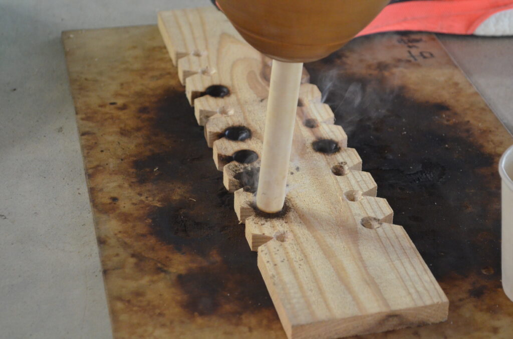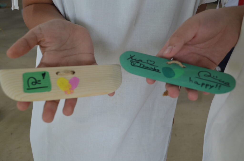 オリジナル木包丁を使って、いよいよ稲刈りスタート!親指で稲穂をしっかり押さえて刈り取ることがポイントですよ。